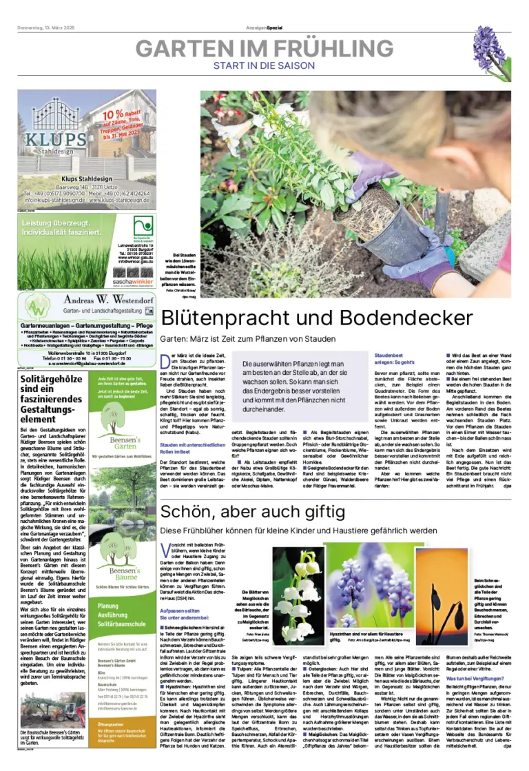 Gestalten Sie Ihre grüne Oase: Die späte Frühlingssaison ist die perfekte Zeit, um dem eigenen Garten besondere Aufmerksamkeit zu schenken und neue Gestaltungsideen zu entwickeln. Begleiten Sie uns auf unseren attraktiven Sonderseiten und geben Sie unseren Leserinnen und Lesern wertvolle Tipps zur Gartengestaltung. Nutzen Sie diese ideale Plattform, um Ihre Angebote gezielt und wirkungsvoll zu präsentieren.