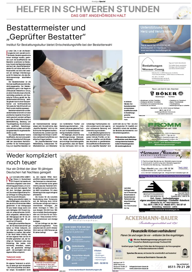 In dieser schweren Phase sind seriöse und kompetente Begleiter unerlässlich: Auf unseren Sonderseiten geben wir Ihnen die Möglichkeit, sich und Ihre Leistungen in angemessenem Rahmen zu präsentieren.