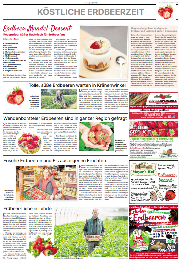Pflückfrisch, gesund und einfach köstlich: Erdbeeren sind ​eines der kulinarischen Highlights in den frühen Sommermonaten. ​ Und frisch aus der Region gepflückt schmecken sie am besten! Laden Sie unsere Leserschaft ​zum Selberpflücken ein oder machen Sie auf Ihren Hofladen aufmerksam. Oder bieten Sie köstliche Erdbeerkreationen ​in Ihrer Gastronomie an?​ Dann seien auch Sie mit Ihren Angeboten dabei und machen Sie Lust auf die rote Köstlichkeit!