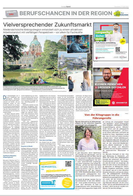 Dieses Thema läuft crossmedial: Ihre Anzeige erscheint als Printanzeige in der Hannoverschen Allgemeinen Zeitung und Neuen Presse sowie als digitale Verlängerung im Portal "Jobs für Niedersachsen" dort auf Wunsch mit ausführlicherer Stellenbeschreibung. Nutzen Sie dieses Sonderthema, um Ihre Angebote und Leistungen gezielt zu vermarkten.