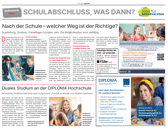 Dieses Thema läuft crossmedial: Ihre Anzeige erscheint als Printanzeige in der Hannoverschen Allgemeinen Zeitung und Neuen Presse sowie als digitale Verlängerung im Portal "Jobs für Niedersachsen" dort auf Wunsch mit ausführlicherer Stellenbeschreibung. Nutzen Sie dieses Sonderthema, um Ihre Angebote und Leistungen gezielt zu vermarkten.